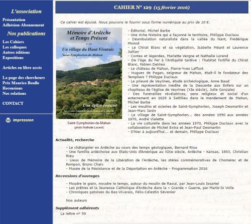 Le cahier N° 129 de février 2016 est consacré à Saint-Symphorien-de-Mahun et à Veyrines.
