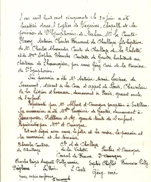 Jacques Mouly a également recopié l’acte de baptême de l’enfant d’une famille notable de la région : Henry Antoine Charles Fernand Comte de Challaye de la Valette qui a été baptisé le 30 juin 1850, ce qui nous fournit de nombreuses informations intéressantes sur Veyrines et ses habitants à cette époque.