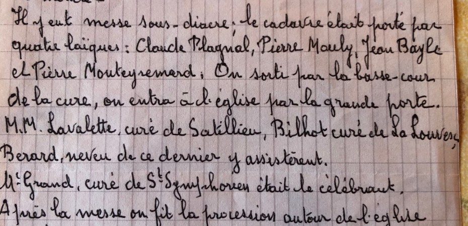 – les noms des porteurs du cercueil dont les familles sont toujours installées à Saint-Symphorien ou dans les villages proches : Plagnal, Mouly, Bayle et Monteyremard.