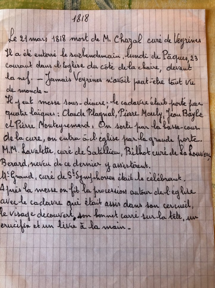 Jacques Mouly a également rédigé un compte-rendu de l’enterrement du dernier prêtre de Veyrines, M. Chazal, dernier curé à la tête de cette petite paroisse. Après le décès de celui-ci en 1818, Veyrines devient un simple succursale de la paroisse de Saint-Symphorien-de-Mahun.