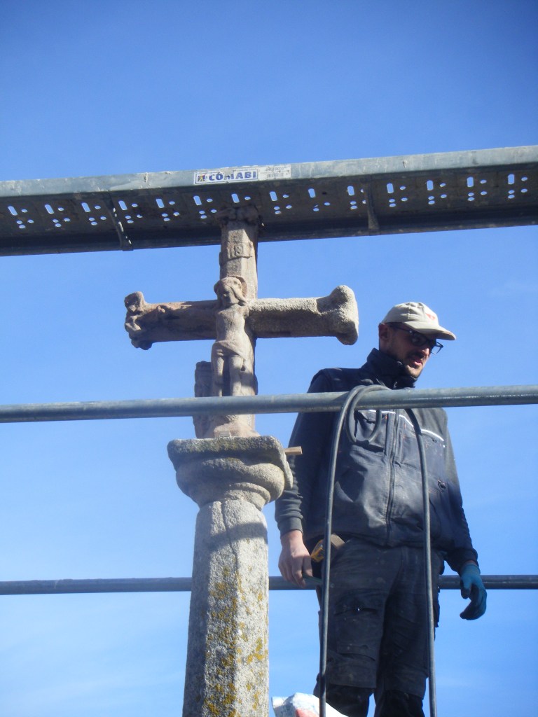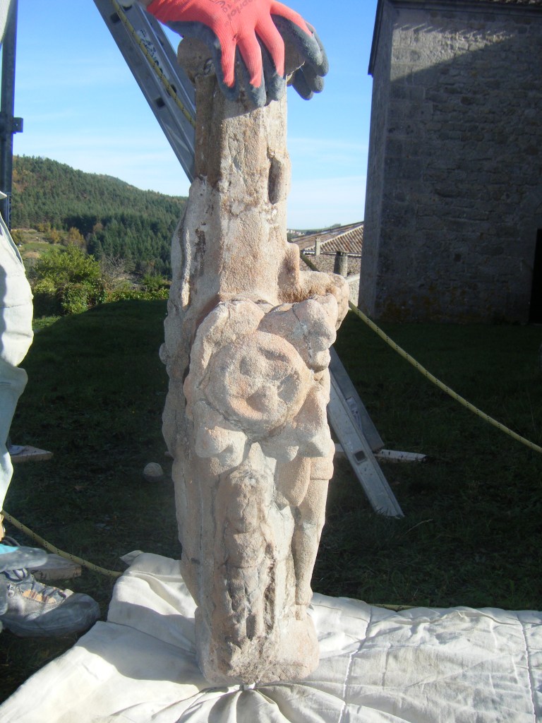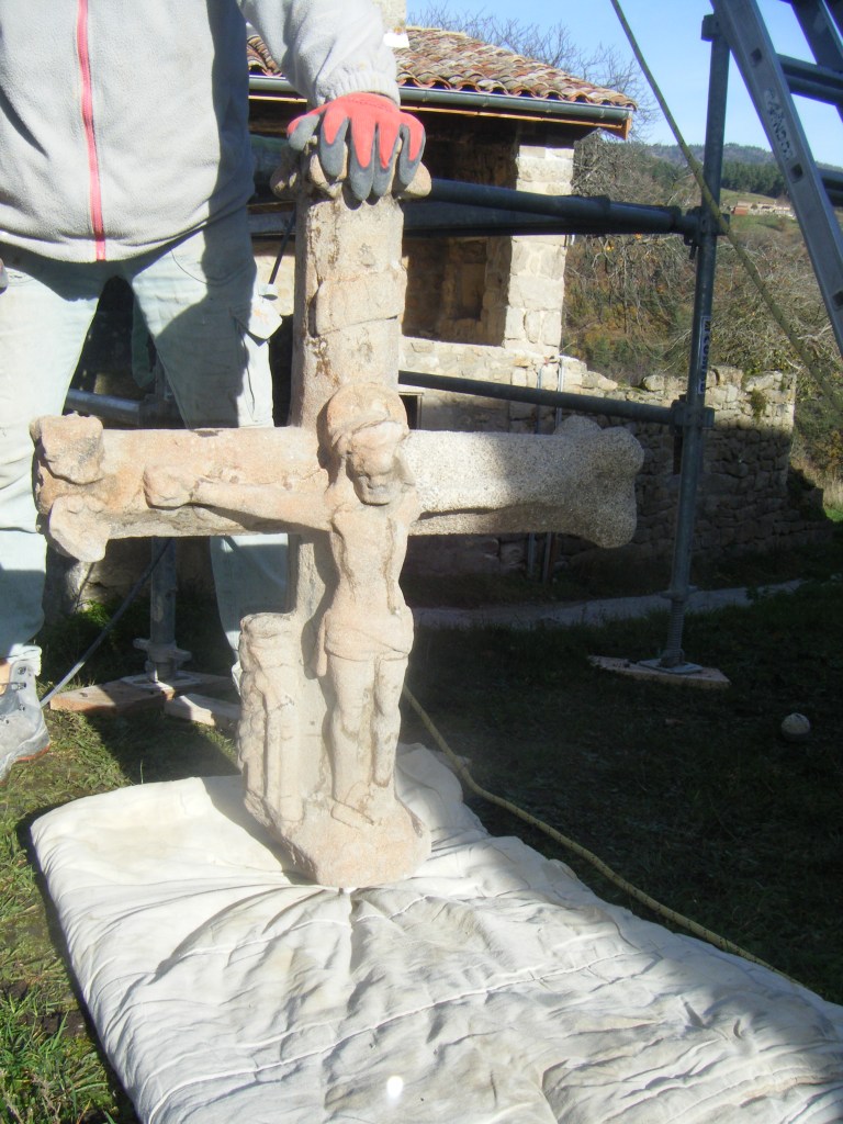 La croix sommitale a donc รฉtรฉ dรฉmontรฉe le 5 novembre par M. Griot et son รฉquipe pour dans un premier temps assurer la sรฉcurisation du site avant de procรฉder ร un examen dรฉtaillรฉ en atelier avant des travaux de stabilisation de la pierre.