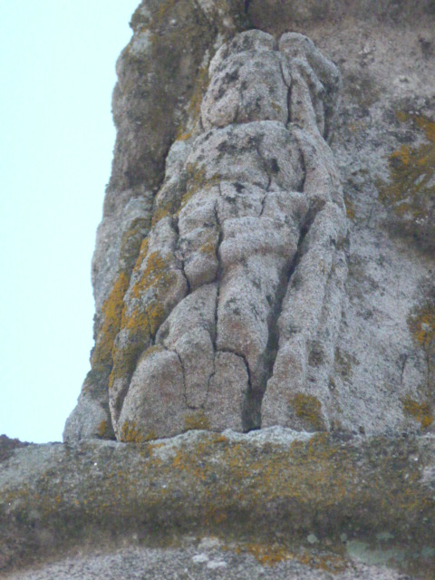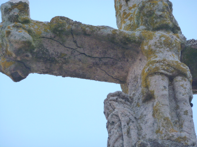 ยซ Jโai pu รดter les piรจces mรฉtalliques qui fixaient le bras de la croix ร gauche du Christ. En fait ce bras est une piรจce rapportรฉe en granit grossier, postรฉrieur ร la croix, tandis que le reste est sculptรฉ dans un grรจs ou arkose trรจs fin, gris clair et rosรฉ. Les goujonnages mรฉtalliques plus ou moins scellรฉs au plomb ont largement contribuรฉ ร exploser la matiรจre. certaines parties se dรฉgradent sous forme de sable comme les chapiteaux du porche. ยป