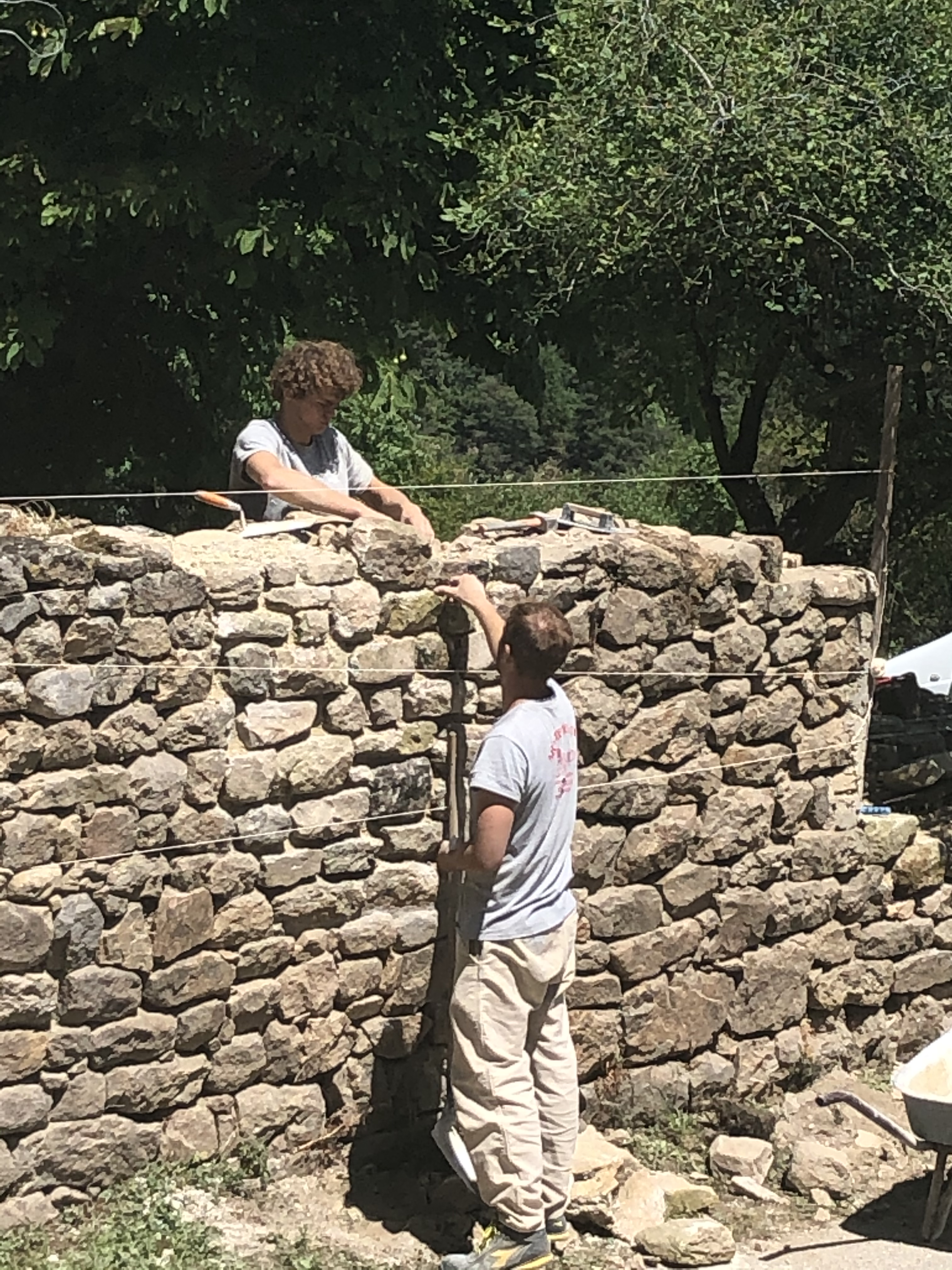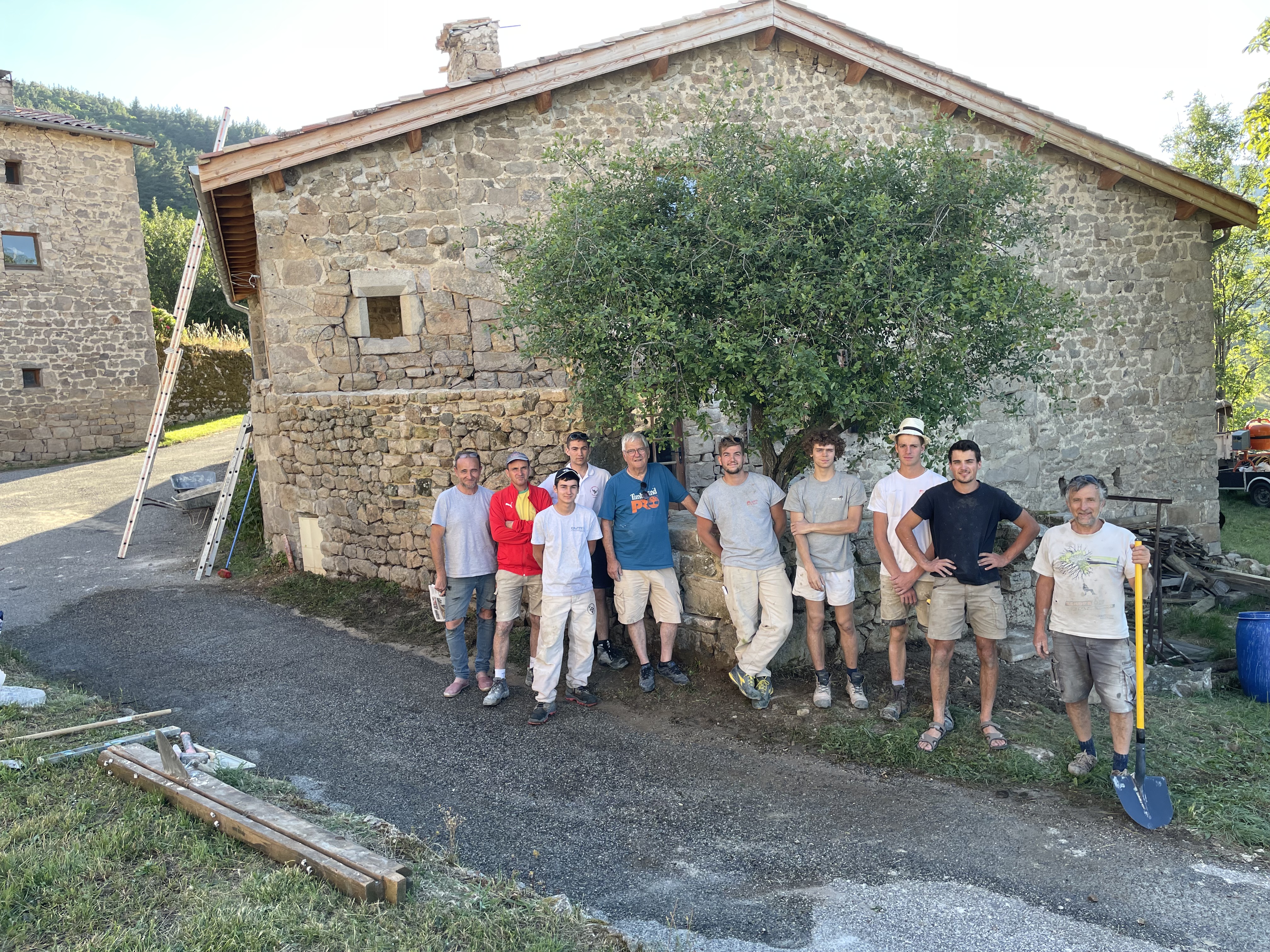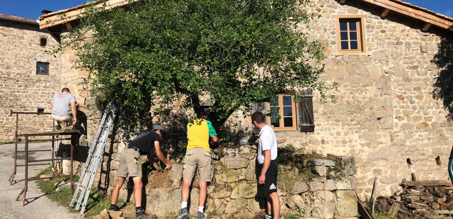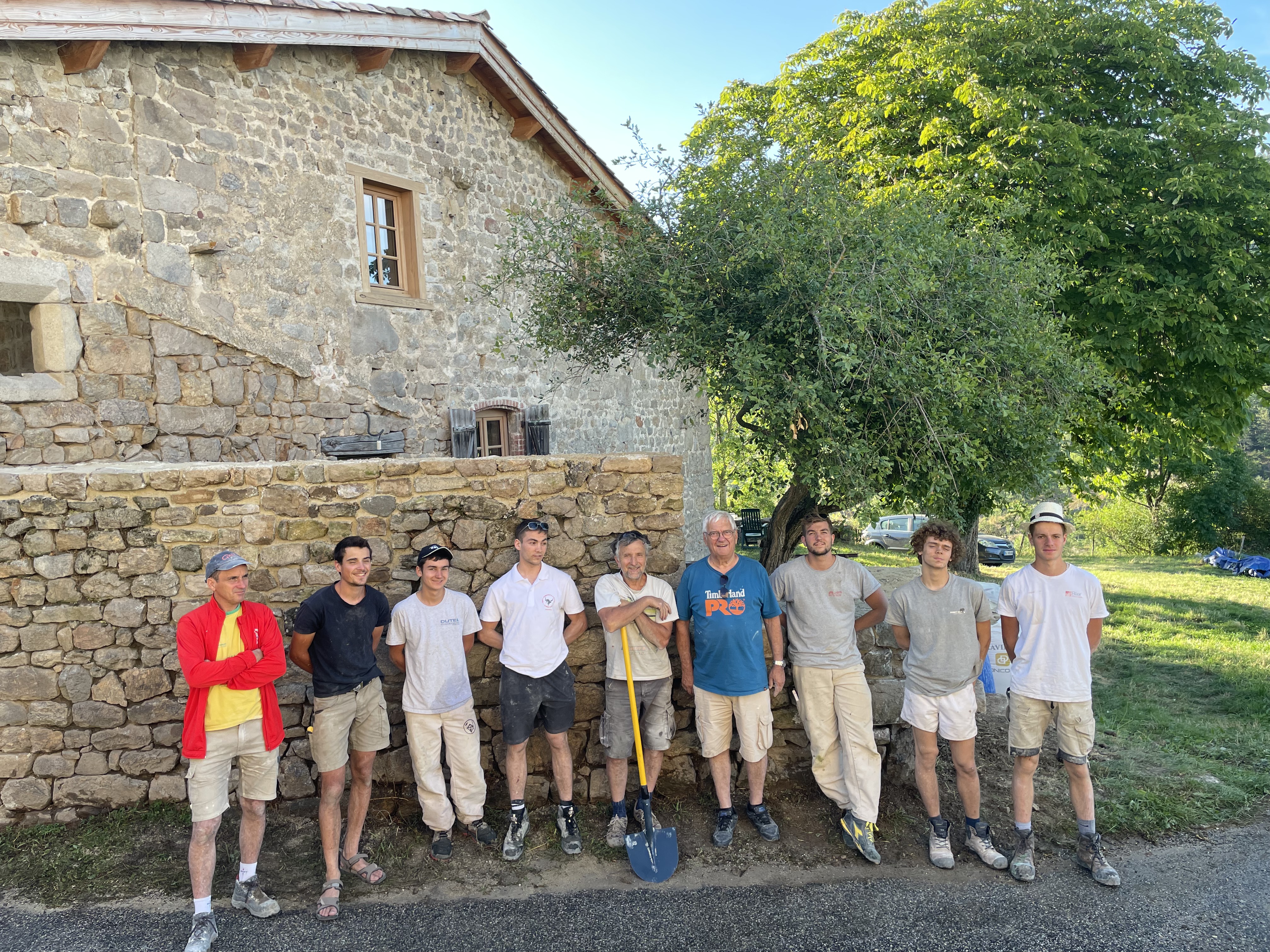 Les amis de Veyrines avaient préalablement effectué le débroussaillage grâce au travail de Roland Pochon et Dominique Laffond afin de permettre l’intervention des futurs maçons les 9 et 10 juillet. Cette équipe de jeunes apprentis de 17 à 24 ans, en formation à l’Ecole des compagnons de Lyon a réalisé une très belle reconstruction du mur sous la direction de leur formateur Benjamin Vaucelle.