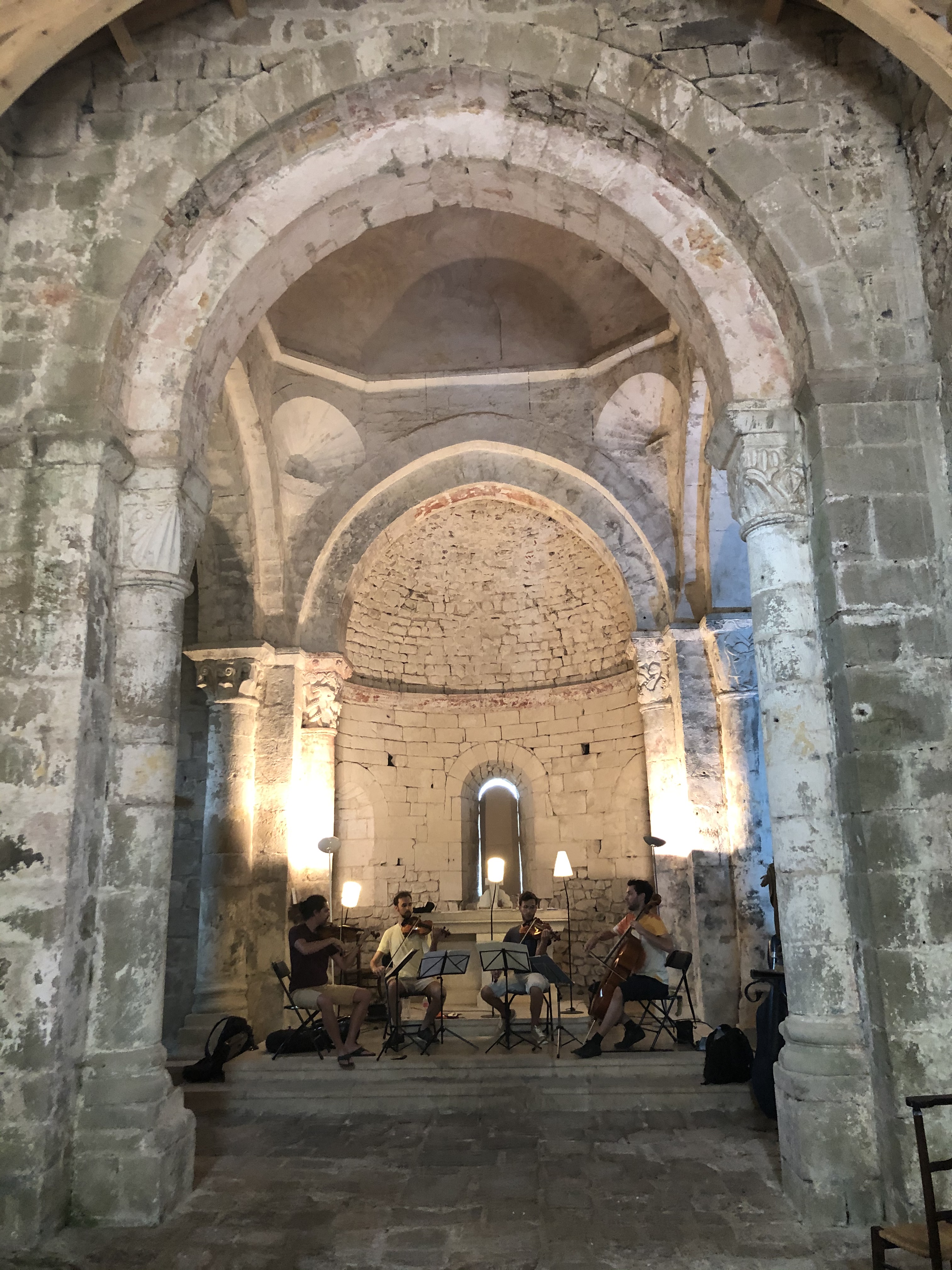 Pour les jeunes musiciens du Quatuor Emana, la soirée avait bien sûr commencé par une séance des répétition dans l’église, comprenant notamment l’accordage des instruments en fonction de l’acoustique du lieu et des conditions météorologiques.