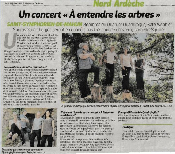 Dans son numéro du 21 juillet 2022 l’Hebdo de l’Ardèche présente l’Ensemble Quadrifoglio, un quatuor musical nord-ardéchois, avant que celui-ci ne donne un concert le 23 juillet dans l’église de Veyrines.