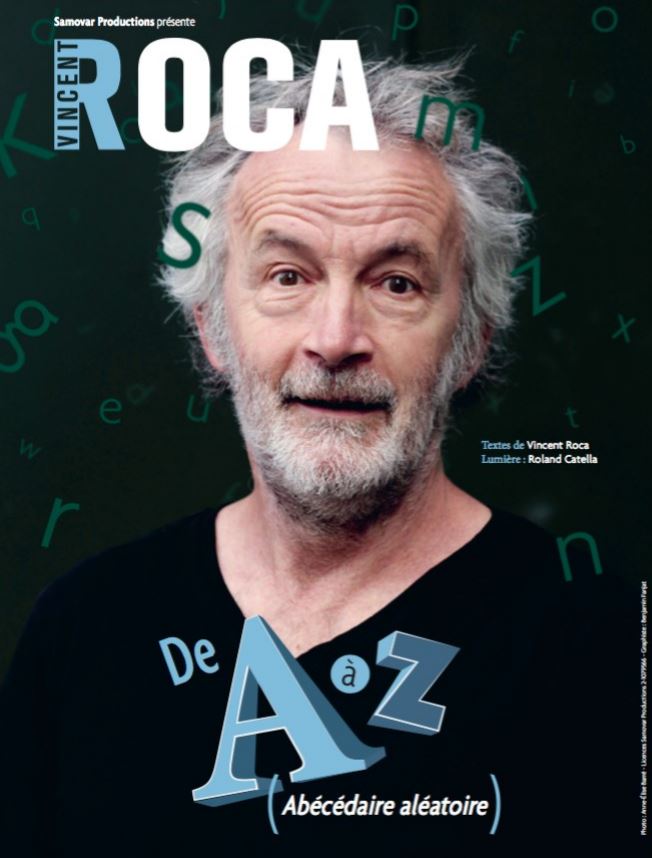 Son nouveau spectacle, « Vincent Roca de A à Z (Abécédaire aléatoire) », est une excursion dans la langue française, où notre héros, balloté par les mots, se prend les pieds dans les cédilles, se rattrape aux apostrophes, crochète les parenthèses qu’il referme soigneusement après digression, un chemin en phrase campagne, avec croisement de sens, ronds-points d’interrogation et accotements joyeusement déstabilisés…