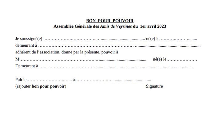 Important : si vous ne pouvez participer à l’Assemblée Générale, merci de remplir le bon pour pouvoir que vous avez reçu (voir ci-dessous) et de l’envoyer au siège de l’association ou de le remettre à un(e) adhérent(e) participant à l’A.G.