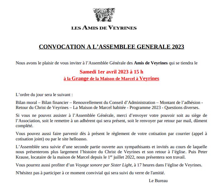 Pour rappel : le règlement de votre cotisation à l’association pour l’année 2023 peut être effectué via Internet à l’adresse suivante : https://www.helloasso.com/associations/les-amis-de-veyrines. Il peut également être fait sur place lors de l’Assemblée Générale ou sous forme d’un chèque envoyé par voie postal au siège de l’association.
