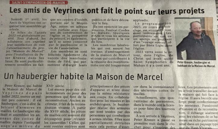 – L’installation cet été de l’haubergier Peter Krause (fabricant d’amures en mailles rivetées), suite au nouvel appel à projet lancé en début d’année 2022. Véritable historien des armures et armes du Moyen-Age, Peter Krause s’est trouvé une grande affinité avec les lieux (l’église du prieuré médiéval de Veyrines, la Maison de Marcel), ainsi qu’avec l’action de sauvegarde du patrimoine que mènent les Amis de Veyrines.
