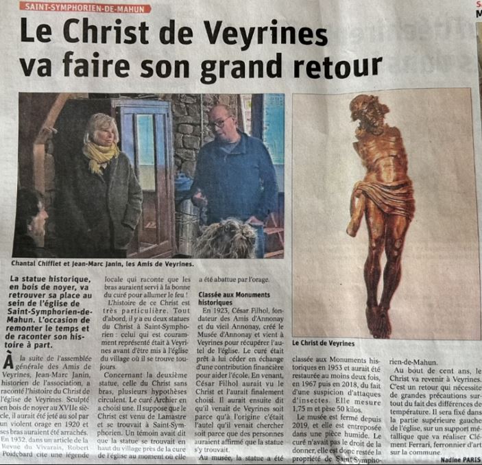 – L’organisation du retour du Christ de Veyrines qui avait été mis en dépôt en 1923 au Musée César Filhol à Annonay après une chute de la croix sur laquelle il était installé. Un accord a été conclu entre les municipalités de Saint-Symphorien-de-Mahun et d’Annonay pour organiser son retour à Veyrines. Un conservateur du patrimoine viendra durant l’année 2023 préciser les modalités de son installation dans l’église.