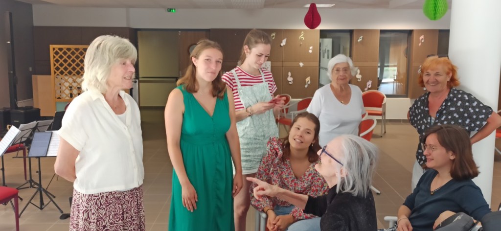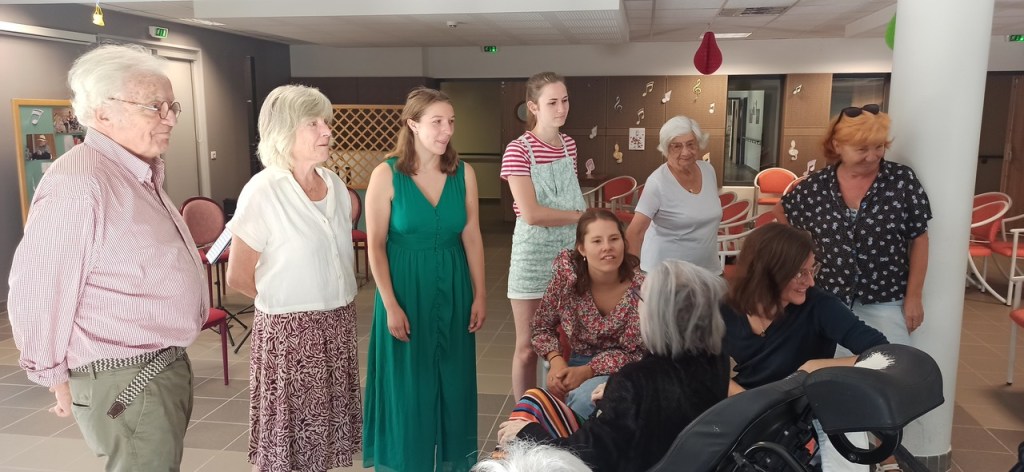 Sur le chemin du départ d’Ardèche, le mercredi 19 juillet, les musiciennes accompagnées de plusieurs membres des Amis de Veyrines sont retournées à l’EHPAD afin de rendre visite à l’une des résidentes qui avait particulièrement apprécié leur concert du lundi.