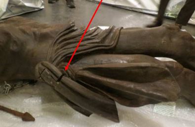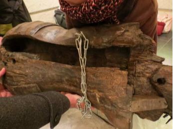 Longtemps accrochée au mur par des chaînes fixée dans sa partie dorsale, la statue d’un poids d’environ 60 kilos est désormais posée au sol dans une salle du premier étage du musée César Filhol.