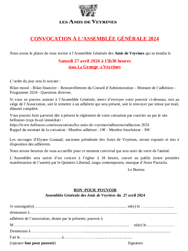 Le conseil d’administration des Amis de Veyrines convoque les adhérents de l’association pour dresser le bilan de l’année 2023 et présenter les perspectives pour l’année 2024.