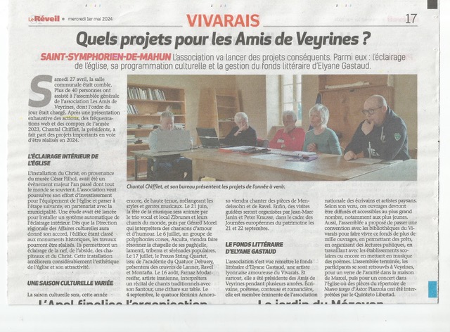 – l’hebdomadaire Le Réveil du Vivarais a mis l’accent sur les projets de l’association (éclairage de l’église, fond littéraire d’Elyane Gastaud…)