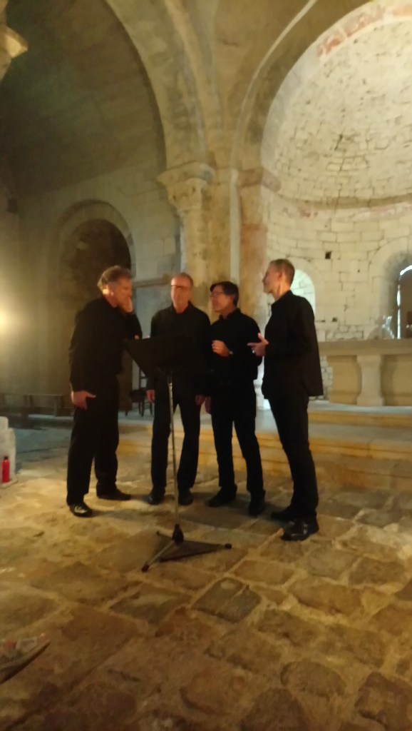 Après une brève présentation de notre ami Pierre Morisse, les quatre chanteurs de l’ensemble vocal sont entrés sur scène pour interpréter un répertoire constitué principalement de chants sacrés et profanes corses mais pas seulement. Voici un petit florilège des oeuvres chantées par Asculta à trois ou à deux voix (certains chants sont écoutables sur Soundcloud) :