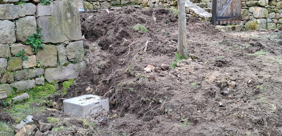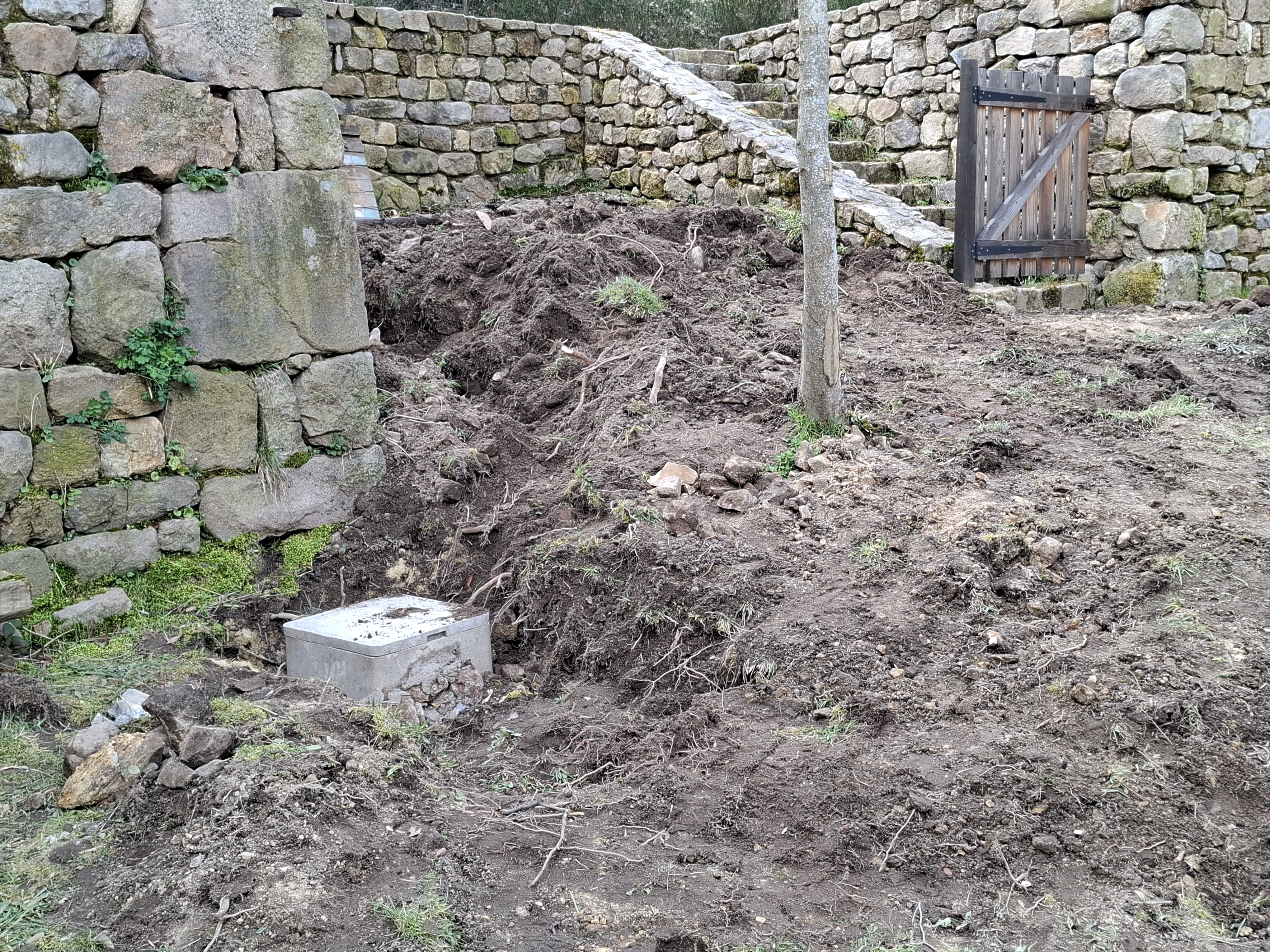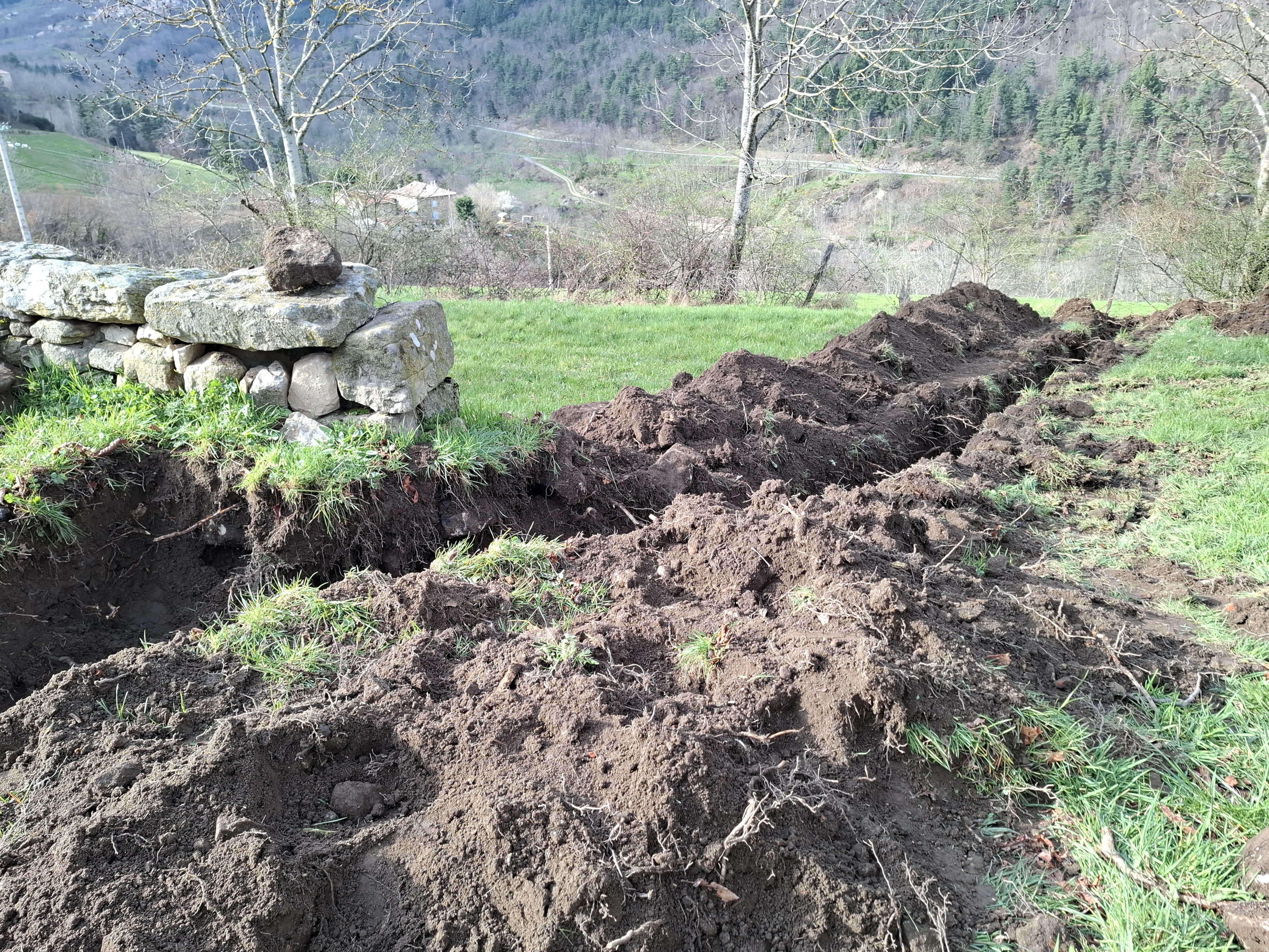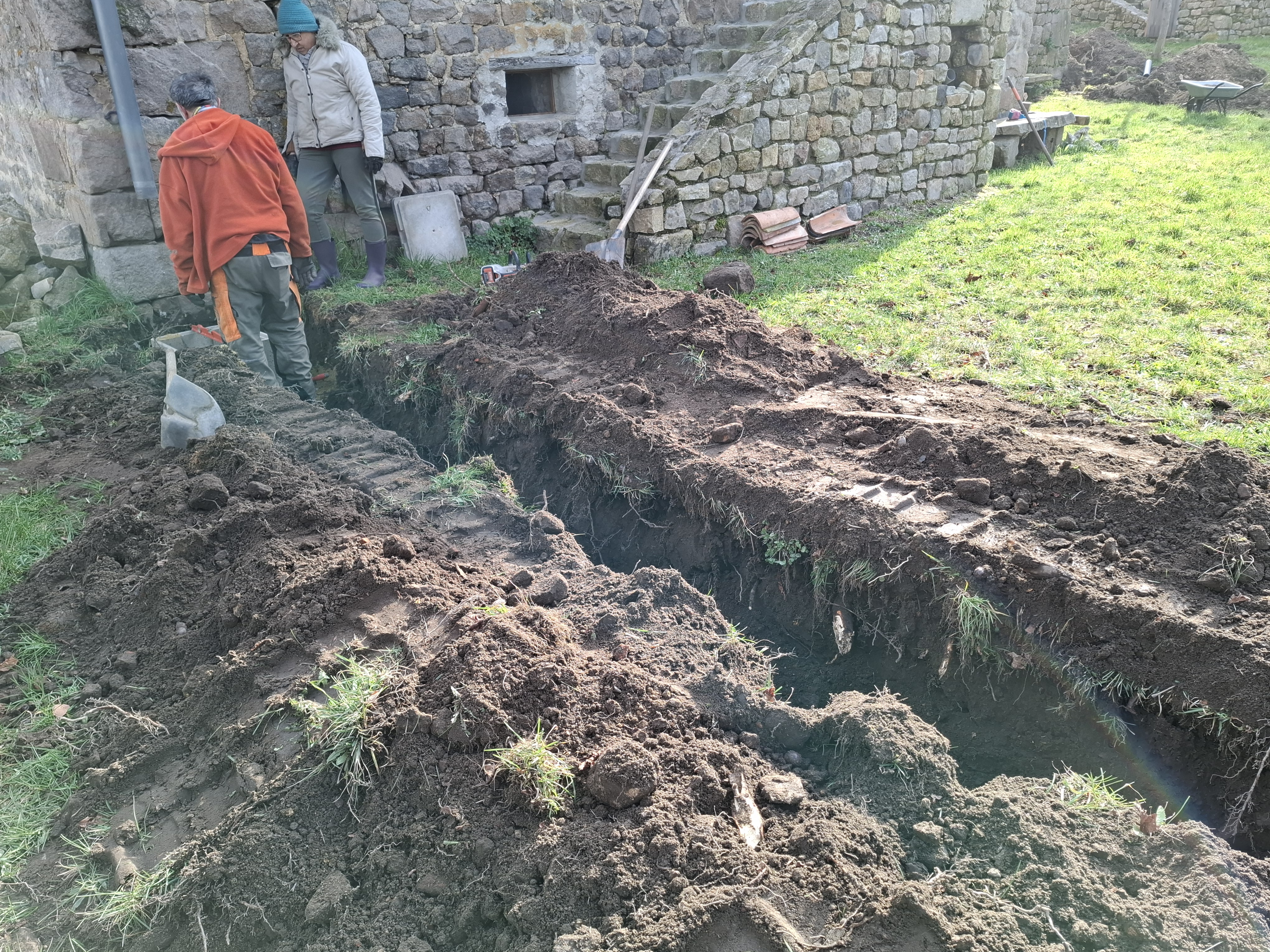 La prochaine étape des travaux consistera à finir le captage et l’évacuation des eaux s’infiltrant dans l’ensemble étable-grange depuis la route avec les opérations suivantes :