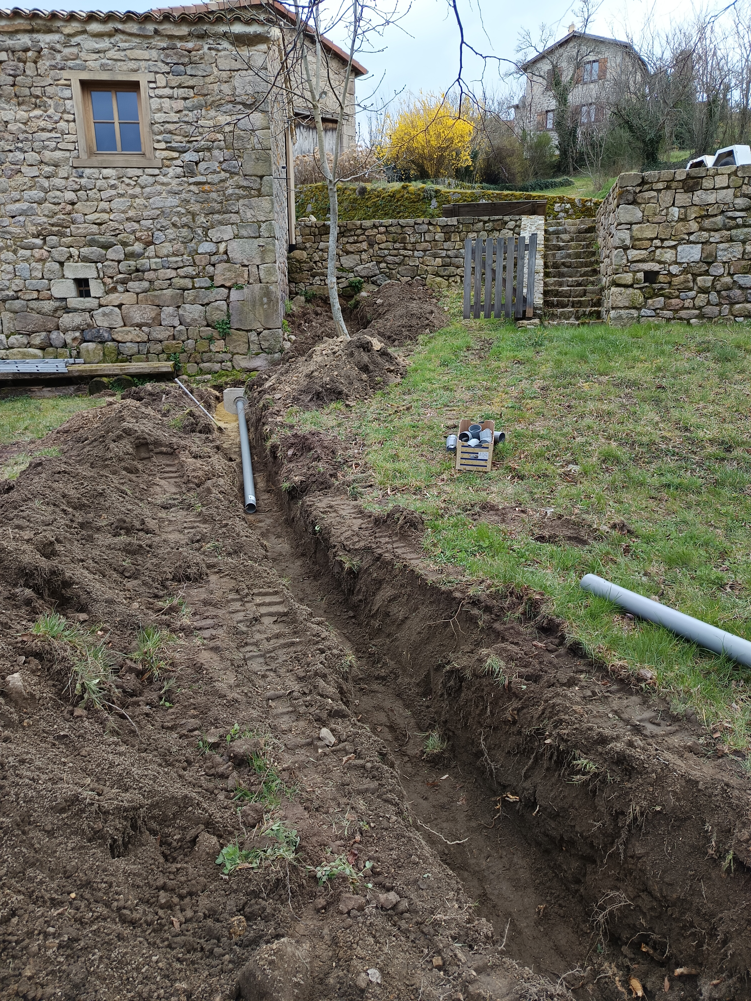 La pose des regards en béton puis des tuyauteries PVC, ainsi que le raccordement des descentes de gouttières aux regards ont été réalisées sous la direction de Dominique.