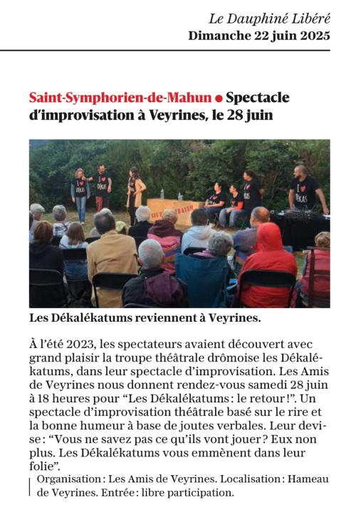 Deux années ont passées depuis que la compagnie de théâtre d’improvisation, Les Dékalékatum, est venue à Veyrines présenter son spectacle du moment : « Les Dékalékatum : 3, 2, 1 impro ! ». Les artistes avaient alors régalé le public grâce à leurs talents d’improvisateurs et leur savoir-faire en matière d’humour sur des sujets variés et pour tous types de situations.