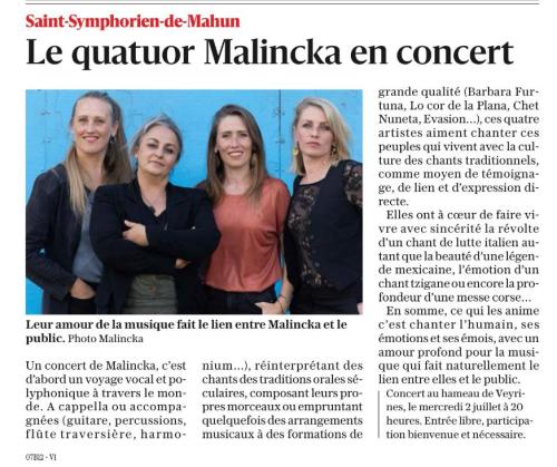 Un concert de Malincka, c’est d’abord un voyage vocal et polyphonique à travers le monde. A cappella ou accompagnées (guitare, percussions, flûte traversière, harmonium…), réinterprétant des chants des traditions orales séculaires, composant leur propres morceaux ou empruntant quelquefois des arrangements musicaux à des formations de grande qualité (Barbara Furtuna, Lo cor de la Plana, Chet Nuneta, Evasion…), ces quatre artistes aiment par-dessus tout chanter ces peuples qui vivent avec la culture des chants traditionnels comme moyen de témoignage, de lien et d’expression directe.
