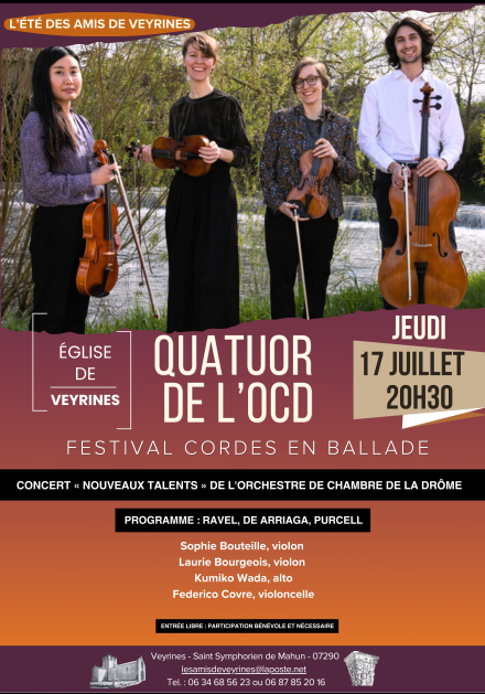 Comme chaque année, les Amis de Veyrines accueillent un concert exceptionnel en lien avec le Festival « Nouveaux Talents » des Cordes en ballade.