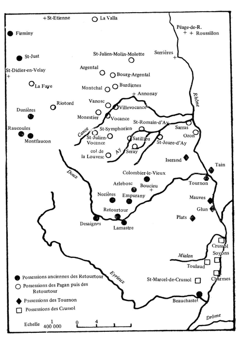 Carte tirée de « Mentalités nobiliaires en Vivarais au XIVème siècle : la succession de Briand de Retourtour » par Marie-Claire Chavarot