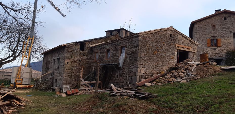 Pour la remise en état comme pour l’agrandissement des ouvertures, les maçons qui ont réalisé le chantier à l’automne 2019 ont travaillé avec de la pierre du pays (granit) pour rester au plus près du mode de construction initiale de la grange de Marcel. Ils ont donc commencé par démonter l’appentis sur la façade nord avant d’effectuer les travaux suivants :